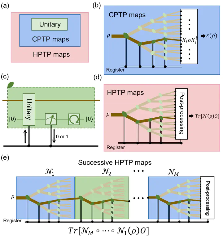 Concept for HPTP maps and their realization.Quantum control has been a cornerstone of quantum information science, driving major advances in quantum computing, quantum communication, and quantum sensing. Over the years, it has enabled the implementation of arbitrary completely positive and trace-preserving (CPTP) maps; an important next step is to extend control to Hermitian-preserving and trace-preserving (HPTP) maps, which underpin applications such as entanglement detection, quantum error mitigation, quantum simulation, and quantum machine learning. Here we present an efficient and fully constructive method for implementing arbitrary HPTP maps. Unlike existing methods that decompose an HPTP map into multiple CPTP maps or approximate it using bipartite Hamiltonians with large Hilbert spaces, our approach compiles a target HPTP map into a single executable CPTP map whose Kraus rank is guaranteed to be no larger than the intrinsic rank of the target HPTP map plus one, followed by simple classical post-processing. Numerical results for inverse noise channels used in quantum error mitigation, including bosonic photon loss, confirm substantial reductions in resources and highlight scalability in higher-dimensional settings. Together with our numerical benchmarks, these results validate the efficiency and versatility of the proposed framework, opening a route to broader quantum-information applications enabled by HPTP processing.